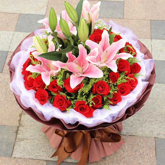 材料包裝: 33朵紅玫瑰,2支多頭粉色百合,滿天星黃鶯搭配,白色紗網(wǎng)內(nèi)襯,褐色瓦楞紙包裝,咖啡色蝴蝶結(jié)扎尾