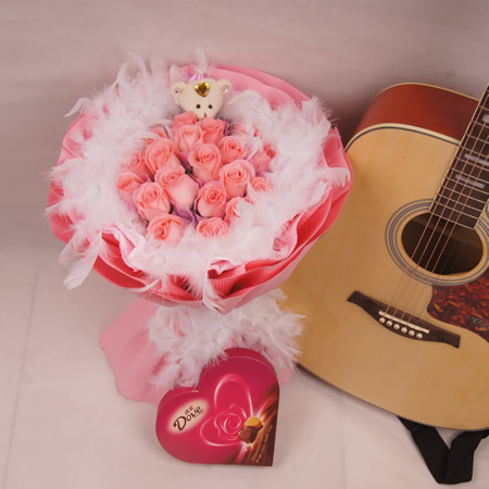 花材:33枝粉玫瑰,1只卡通小熊,絨毛圍邊,德芙心形巧克力109g一盒;包裝:粉色包裝紙,圓形包裝