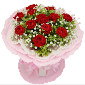 花材:12支紅色康乃馨,黃鶯滿天星搭配;包裝:粉色皺紋紙包裝,絲帶結扎