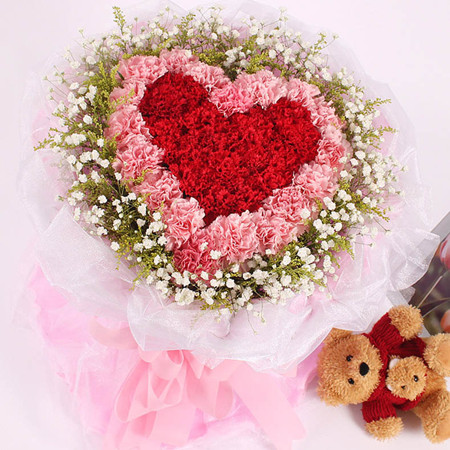 花材:紅、粉康乃馨共66朵,滿天星外圍;包裝:淡粉色紗網心形包裝