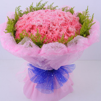 花材:99朵粉色康乃馨,黃鶯圍邊;包裝:里面粉色皺紋紙包裝,外面粉色紗網包裝,紫色紗網結扎