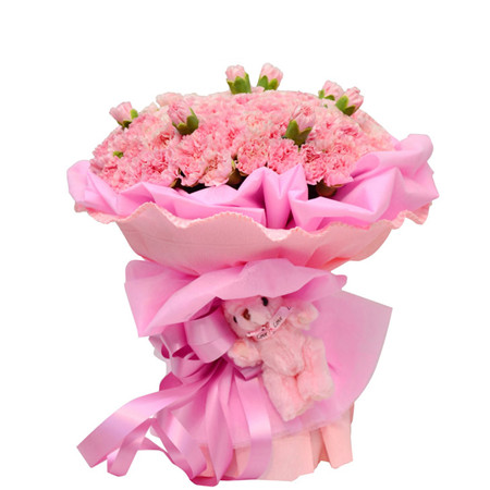 商品簡介:花材:33朵粉色康乃馨,搭配小熊;包裝:粉色棉紙內(nèi)襯,粉色皺紋紙外圍,絲帶結(jié)扎