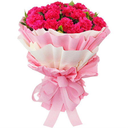 花材:21朵紅色康乃馨,綠葉搭配;包裝:淡粉色、淡黃色皺紋紙相間包裝,絲帶結(jié)扎