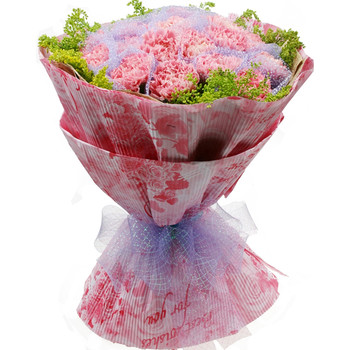 商品簡介:花材:11朵粉色康乃馨,黃鶯外圍;包裝:紫色紗網單只包裝,粉色花紋紙整體包裝,紫色紗網結扎