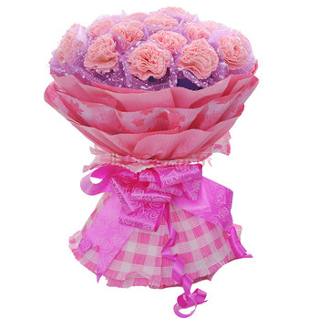 材料包裝: 花材:11朵粉色康乃馨;包裝:粉色花紋紙圓形包裝