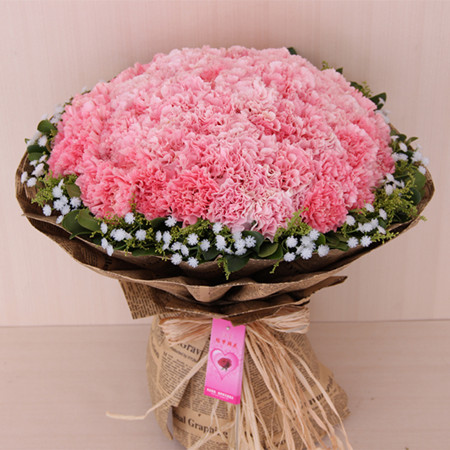 花材:99朵粉色康乃馨,滿天星綠葉外圍;包裝:英文紙圓形包裝