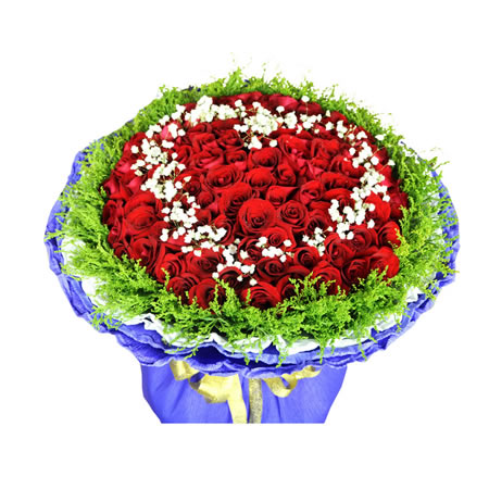 花材:99朵紅玫瑰,搭配黃鶯、滿天星 包裝:里面白色皺紋紙包裝,外面藍色皺紋紙包裝,蝴蝶結結扎