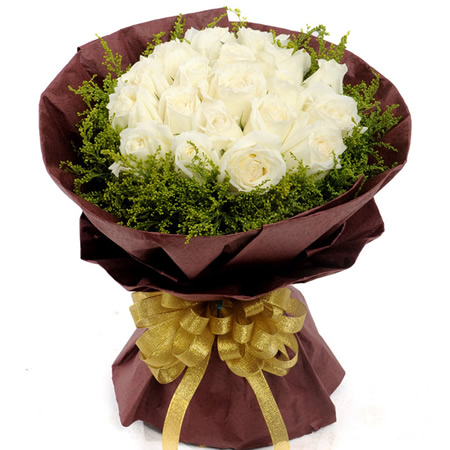 花材:21朵白玫瑰,黃鶯圍邊 包裝:咖啡色棉紙包裝,絲帶結扎