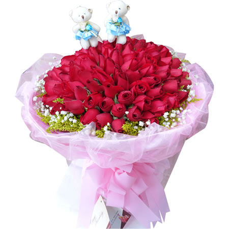 商品簡介:花材:99朵玫瑰加兩只小熊,滿天星、黃鶯圍邊 包裝:粉色紗網(wǎng)包裝,蝴蝶結(jié)結(jié)扎
