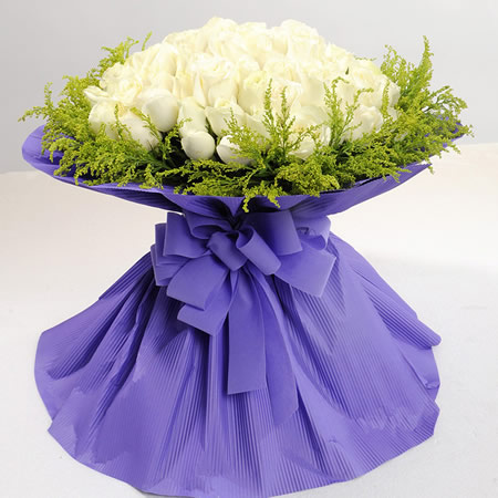 材料包裝: 花材:99朵白玫瑰,黃鶯圍邊 包裝:紫色皺紋紙包裝,絲帶結扎