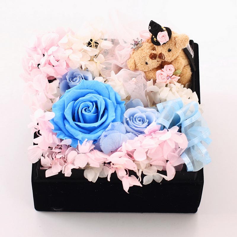 主材:一對情侶熊,3朵藍(lán)玫瑰配材:繡球 尺寸:15*15*12cm