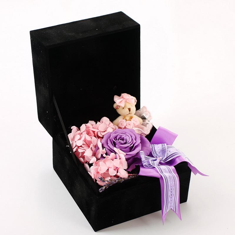 主材:一只小熊+1朵5-6CM玫瑰花 配材:繡球,絲帶 尺寸:12*12*10cm
