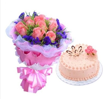 商品簡介:11朵粉玫瑰+8寸鮮奶蛋糕,白色紗網粉色卷邊紙雙層包裝