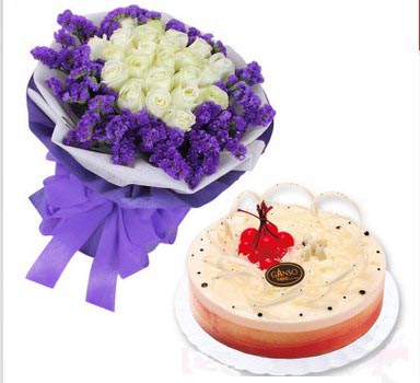 11朵白玫瑰+8寸蛋糕,紫色勿忘我圍邊豐滿