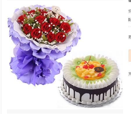 商品簡介:11支紅玫瑰送一只小熊,配黃茵同滿天星;圖片是8寸鮮奶蛋糕,紫色粉色卷邊紙包裝