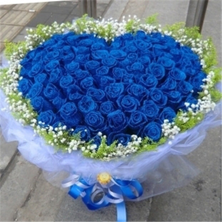 商品簡介:99支藍色妖姬 心形包裝滿天星外圍 藍色紗網包裝.