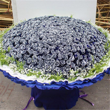 520枝藍(lán)色妖姬 滿天星黃鶯外圍 白色皺紋紙內(nèi)襯 藍(lán)色卷邊紙外包 藍(lán)色絲帶扎編