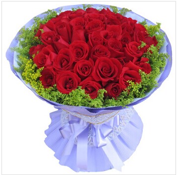 商品簡介:33朵紅玫瑰 綠草外圍 淡紫色皺紋紙 包裝 紫色蝴蝶結(jié)扎尾