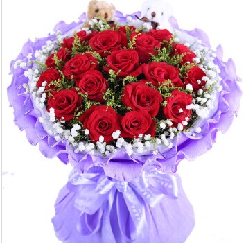 商品簡介:19枝紅玫瑰 黃英搭配 滿天星外圍 紫色皺紋紙包裝 可愛小熊2只 紫色蝴蝶結扎尾