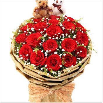 商品簡介:19枝紅玫瑰 滿天星黃鶯搭配 英文紙包裝 可愛小熊2只
