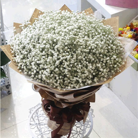 滿天星花束 高檔英文紙包裝 咖啡色蝴蝶結扎尾