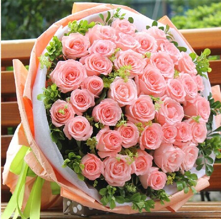 商品簡介:33枝粉玫瑰 黃鶯搭配 白色高檔紙內(nèi)層 橘色高檔紙外層 綠色蝴蝶結(jié)扎尾
