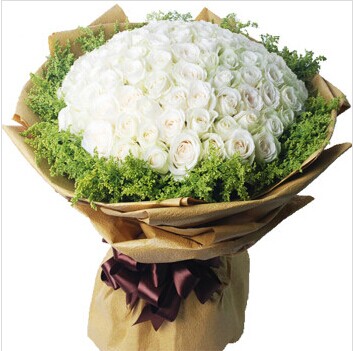 商品簡介:99枝白玫瑰 黃鶯外圍 牛皮紙外圍 咖啡色蝴蝶結扎尾