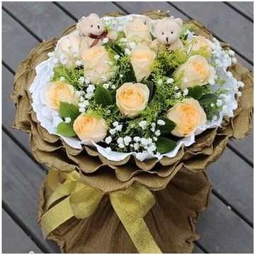 商品簡介:花材:11朵香檳玫瑰加2只小熊,黃鶯、滿天星豐滿,綠葉點綴 包裝:白色裙邊紙內襯,外圍棕色裙邊紙圓形包裝