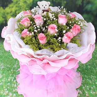 商品簡介:花材:11朵粉玫瑰 1只小熊 滿天星黃鶯搭配 包裝:白色棉紙內(nèi)襯,淺粉色裙邊紙外包