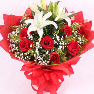 花材:11朵紅玫瑰,2支多頭百合,黃鶯滿天星豐滿;包裝:紅色棉紙包裝,同色蝴蝶結束扎