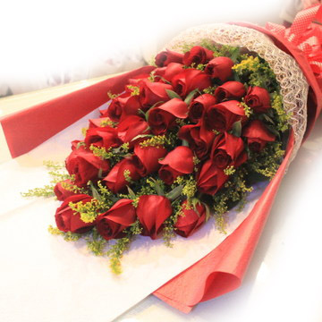 商品簡(jiǎn)介:花材:33朵A級(jí)紅玫瑰,黃鶯豐滿;包裝:里層淺色白色手揉紙,外層桃紅色手揉紙,托手處圍網(wǎng)紗,單面花束