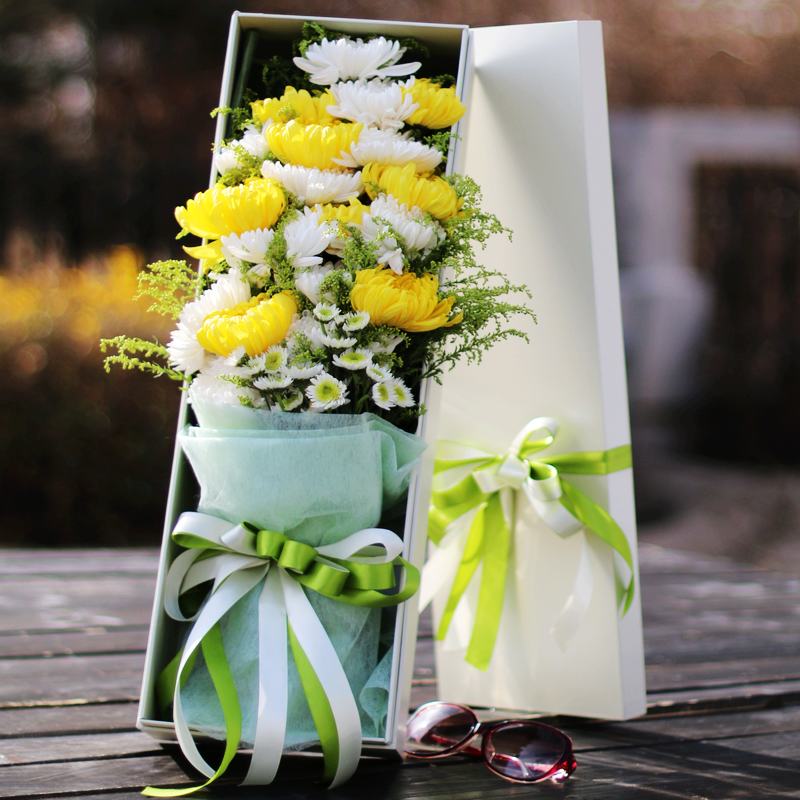白菊花13支黃菊花13支小雛菊搭配扇形包裝,高檔禮盒