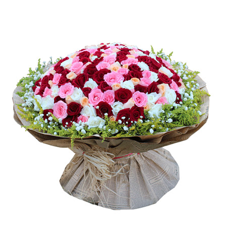 商品簡(jiǎn)介:99朵紅.粉.白.香檳搭配,滿天星黃鶯圍繞,高檔英文紙包裝。