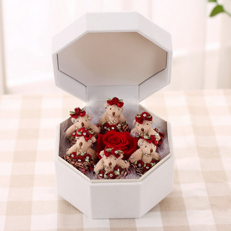 主材:1朵5-6CM玫瑰,6只高檔小熊 配材:羽毛 尺寸: 八角盒,直徑18*高12CM