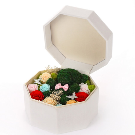 主材:1只大號苔蘚熊12CM,9朵玫瑰花,3-4CM。 配材:滿天星,苔蘚 尺寸: 八角盒,直徑18*高12CM