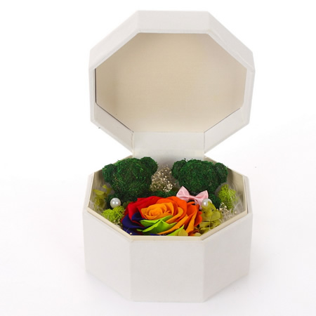 主材:2只小號苔蘚熊+一朵10CM巨型七彩進口玫瑰花 配材:滿天星,苔蘚,繡球 尺寸: 八角盒,直徑18*高12CM