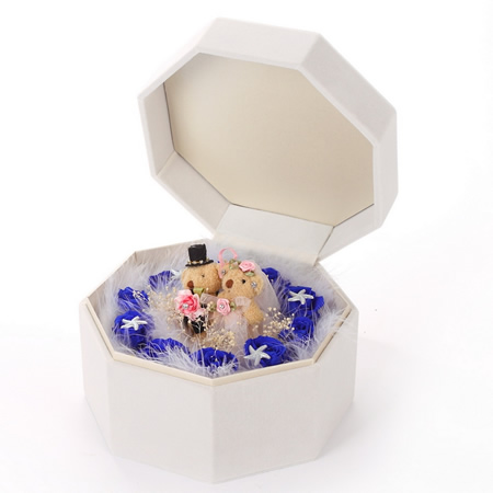 主材:1對高檔小熊+9朵玫瑰(2-3CM) 配材:滿天星,羽毛 尺寸: 八角盒,直徑18*高12CM
