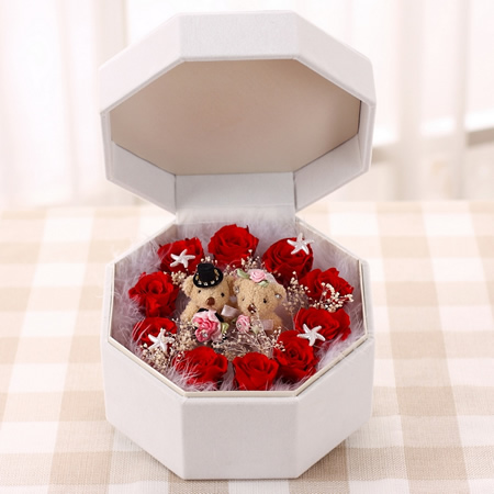 主材:1對高檔小熊+9朵玫瑰(2-3CM) 配材:滿天星,羽毛 尺寸: 八角盒,直徑18*高12CM