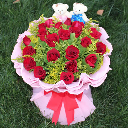 商品簡介:21朵紅玫瑰+2只卡通小熊,黃鶯點綴,粉色卷邊紙圓形包裝,紅色蝴蝶結
