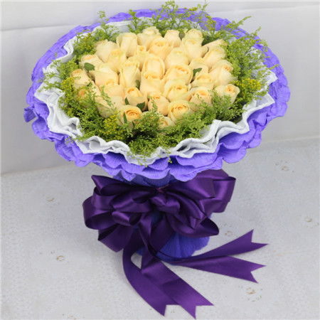 商品簡介:33支香檳玫瑰 黃鶯圍繞 白色皺紋紙內襯 紫色皺紋紙外襯