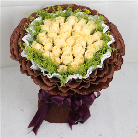 商品簡(jiǎn)介:33支香檳玫瑰 黃鶯圍繞 白色皺紋紙內(nèi)襯 棕色皺紋紙外襯