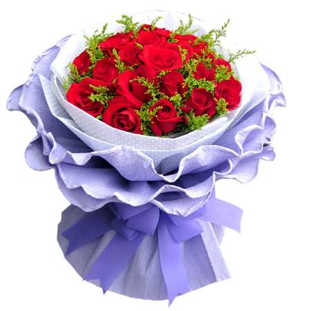 21支紅玫瑰 黃鶯搭配 白色皺紋紙內(nèi)襯 紫色皺紋紙外襯