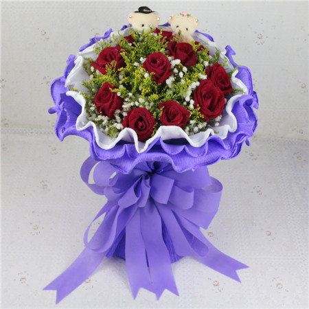 材料包裝: 11支紅玫瑰 2支卡通小熊 黃鶯搭配 紫色卷邊紙包裝