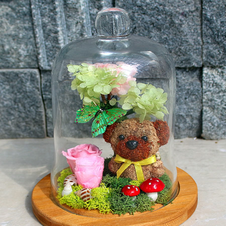 2只鉆石玫瑰 青苔小熊一只 裝飾樹,進口繡球,青苔 蝴蝶 蘑菇等裝飾