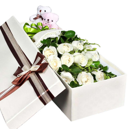 11朵白玫瑰+2支卡通小熊,精美禮盒