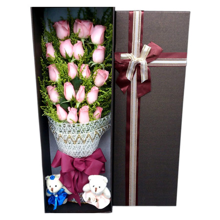 商品簡介:19支粉玫瑰黃鶯搭配 2個可愛小熊 禮盒包裝