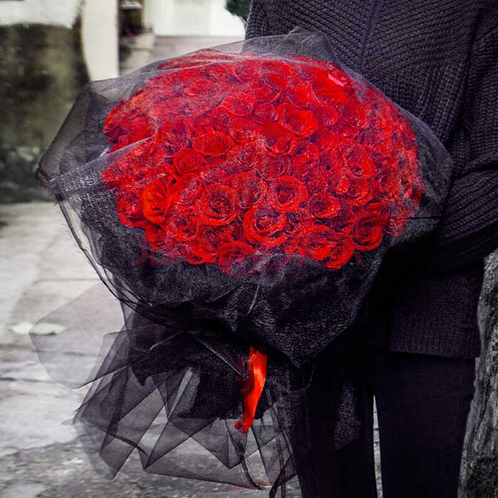 99支紅玫瑰,黑色包裝紙包裝,黑紗包裹