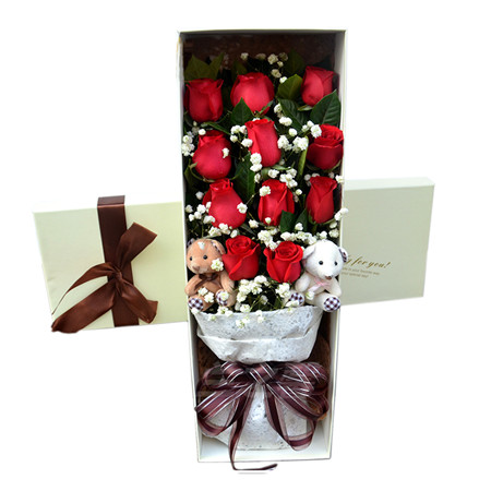 11支紅玫瑰 滿天星搭配 2個可愛小熊 禮盒包裝
