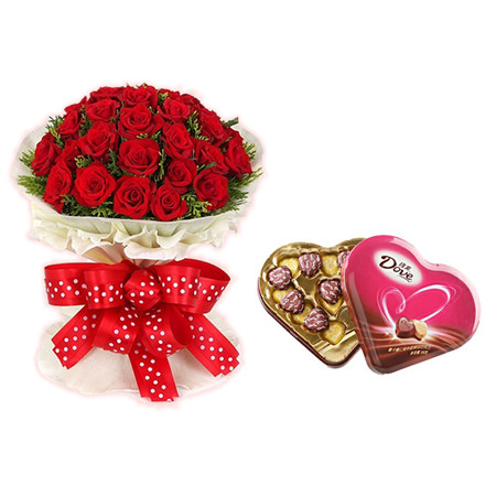 21朵紅玫瑰,黃鶯適量點綴,粉色裙邊紙圓形包裝 1盒98g德芙心語巧克力