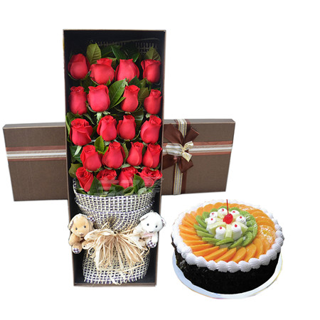 材料包裝: 21朵紅玫瑰;禮盒裝。 8寸水果蛋糕